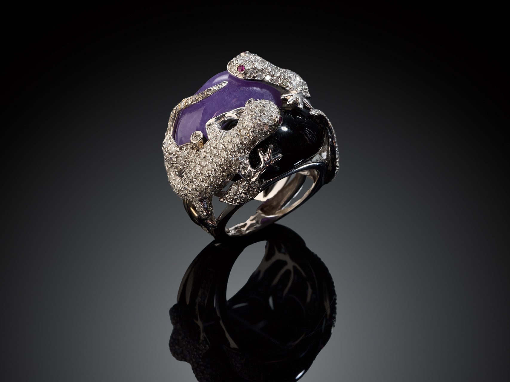 Gredzens ar briljantiem,ahātu, halcedonu, rubīniem un safīru