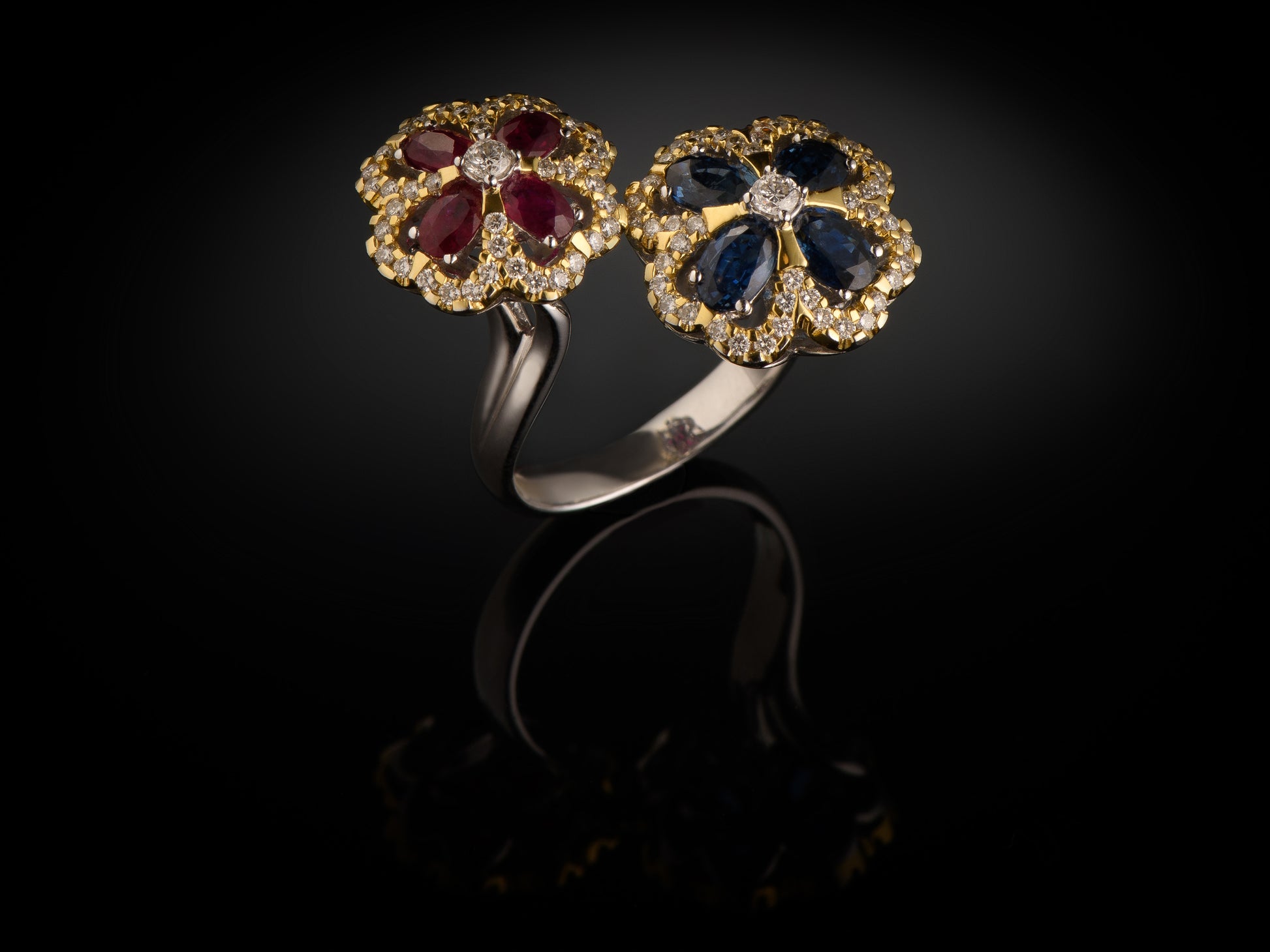 Baltais/dzeltenais zelts 750, svars 14.05 gr, 84 briljanti 0.92ct, 2 briljanti 0.18ct, 4 rubīni 1.28ct, 4 safīri 2.19ct