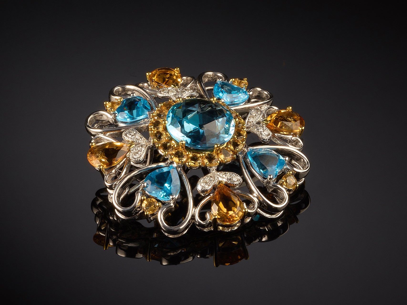 Брошь/кулон с бриллиантами, цитринами и голубыми топазами