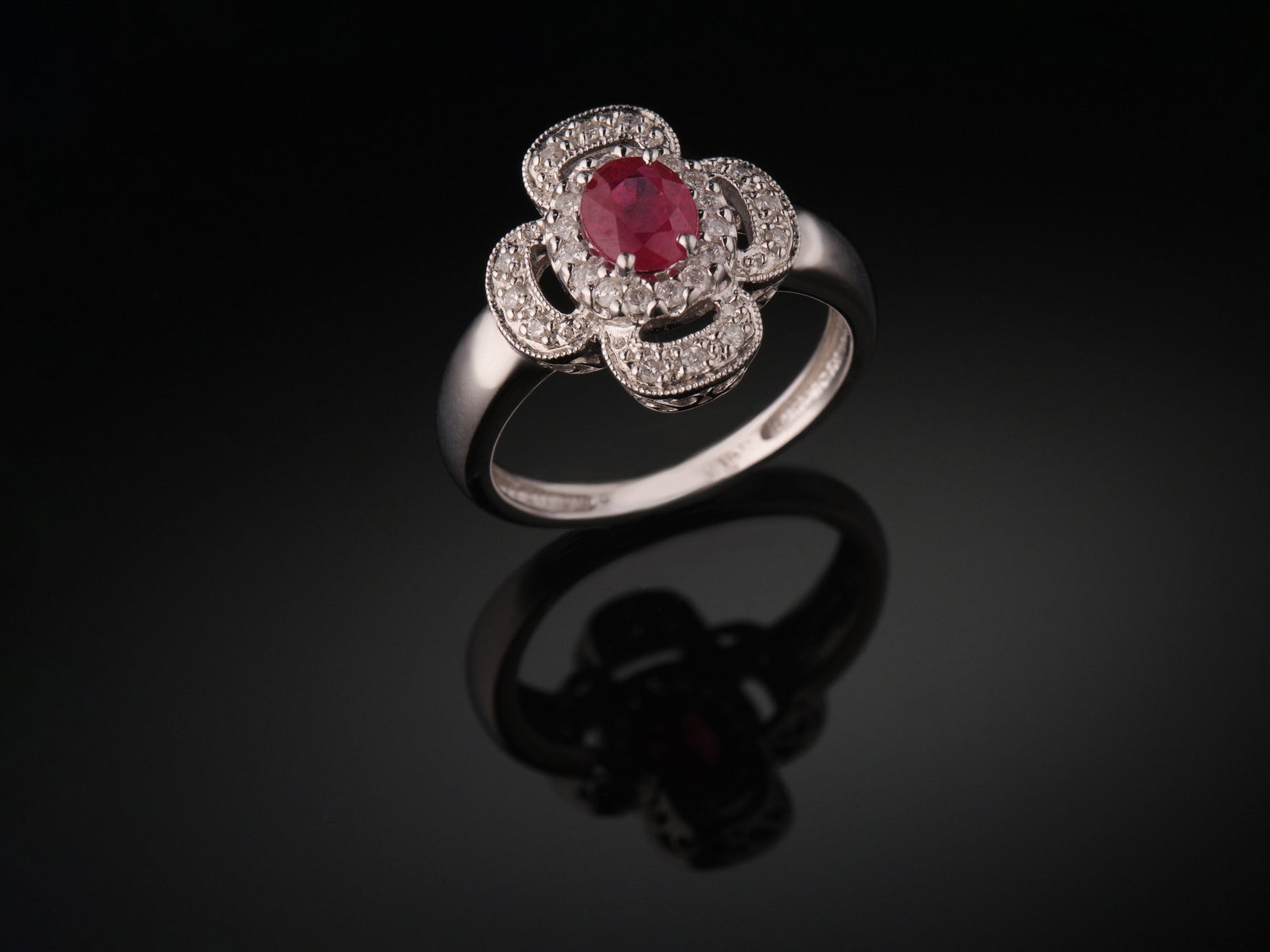 Белое золото, проба 585, вес 3.70г, 28 бриллиантов 0.28ct, 1 рубин 0.96ct
