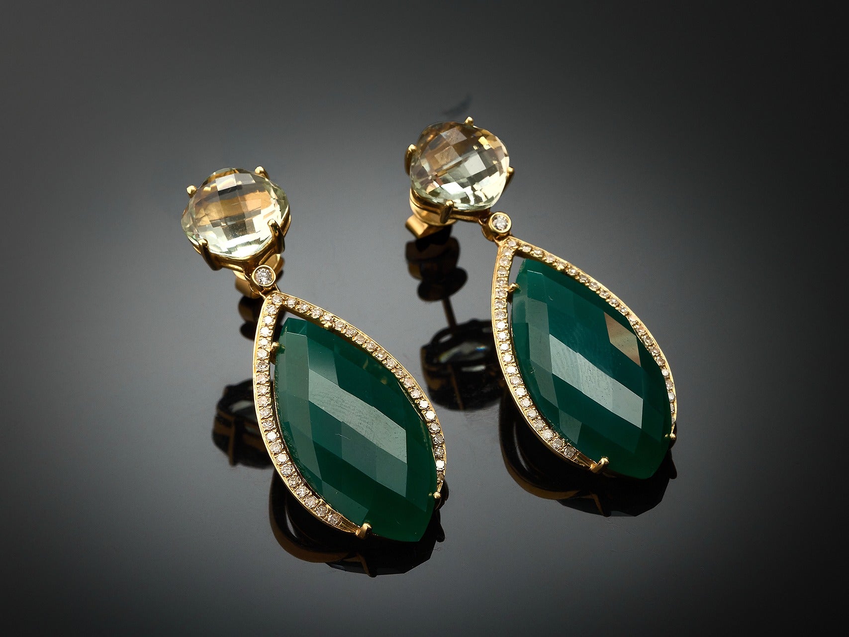 Серьги с бриллиантами, зелёными аметистами и зелёными агатами