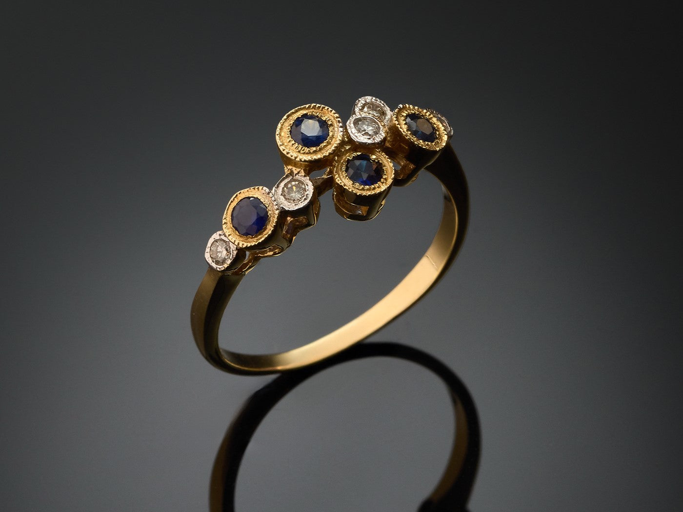 Жёлтое золото, проба 585, вес 2.54г, 4 бриллианта 0.06ct, 4 сапфира 0.28ct