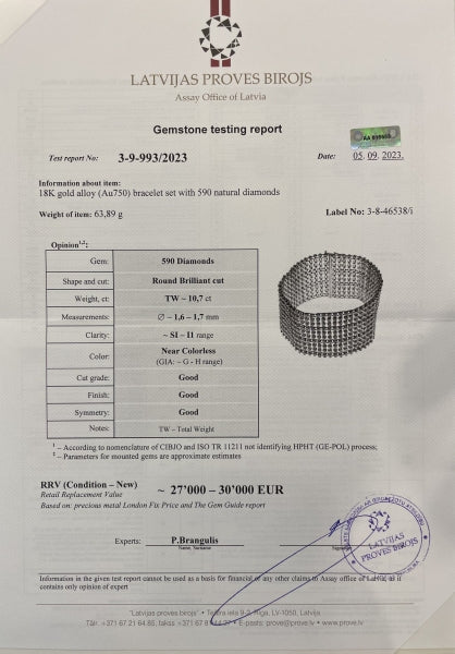 Белое золото, проба 750, вес 63.89г, 590 круглых бриллиантов 10.70ct