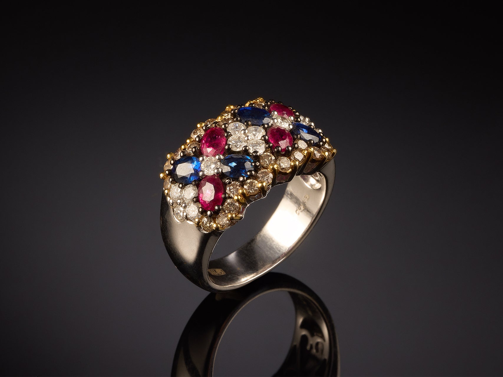 Белое золото, проба 750, вес 10.24г, 40 бриллиантов 1.42ct, 4 рубина 1.02ct, 4 сапфира 1.06ct