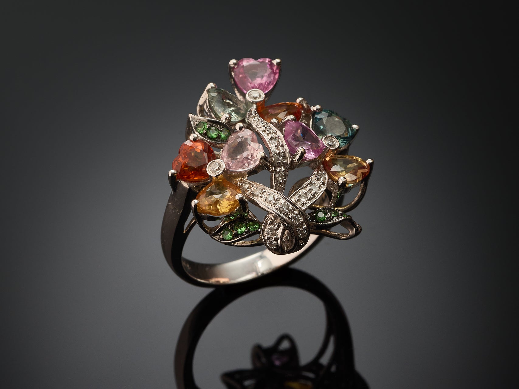 Кольцо с бриллиантами, цветными сапфирами и цаворитами