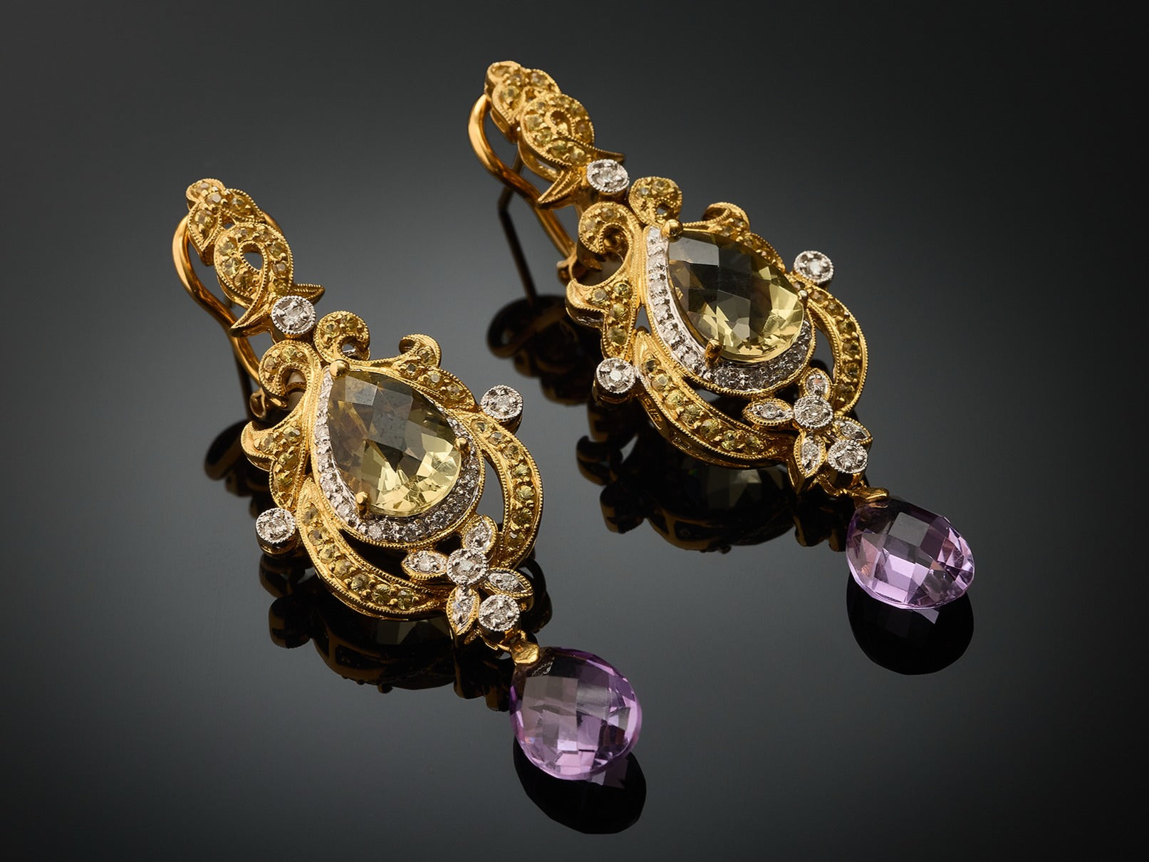 Жёлтое золото, проба 750, вес 15.28г, бриллианты 0.20ct, жёлтые сапфиры 1.62ct, 2 аметиста 9.22ct, 2 зелёных аметиста 8.26ct